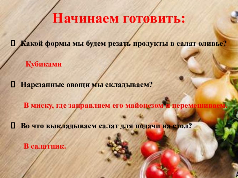 Начинаем готовить:Какой формы мы будем резать продукты в салат оливье? 	 КубикамиНарезанные овощи мы складываем? 	В миску,