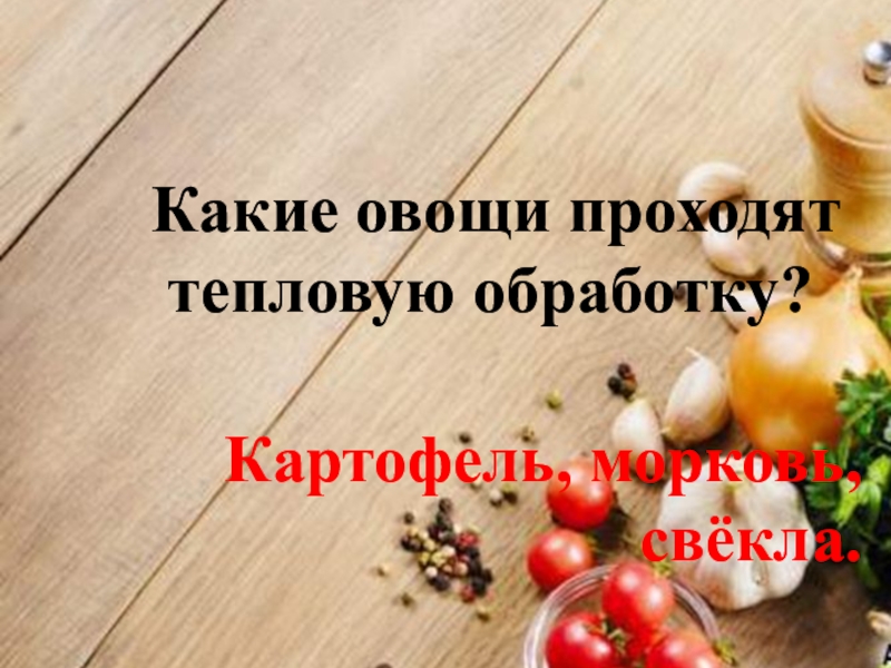 Картофель, морковь, свёкла.	Какие овощи проходят тепловую обработку?