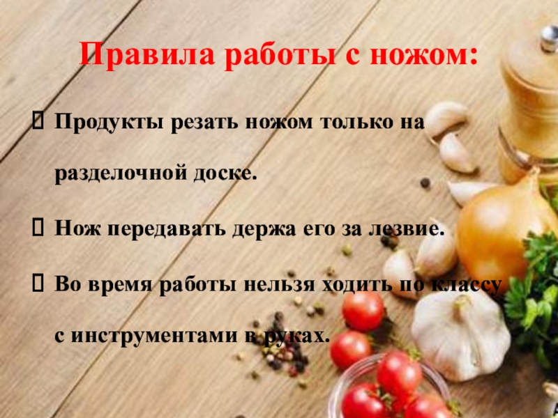 Правила работы с ножом:Продукты резать ножом только на разделочной доске.Нож передавать держа его за лезвие.Во время работы