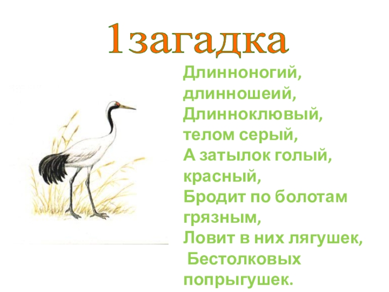 1загадкаДлинноногий, длинношеий,Длинноклювый, телом серый,А затылок голый, красный,Бродит по болотам грязным,Ловит в них лягушек, Бестолковых попрыгушек.
