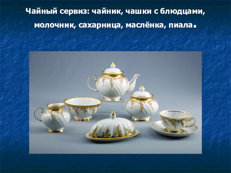 Слайд 9Чайный сервиз: чайник, чашки с блюдцами, молочник, сахарница, маслёнка, пиала.