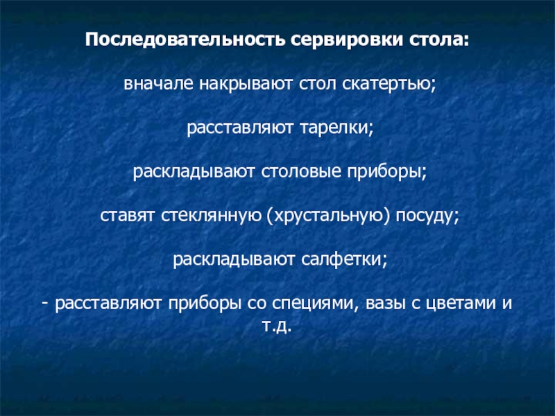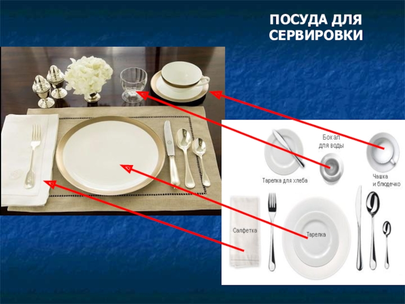 расстановка всех необходимых, предметов — посуды, приборов, салфеток и др.