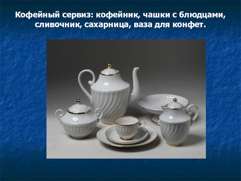Слайд 10Кофейный сервиз: кофейник, чашки с блюдцами, сливочник, сахарница, ваза для конфет.