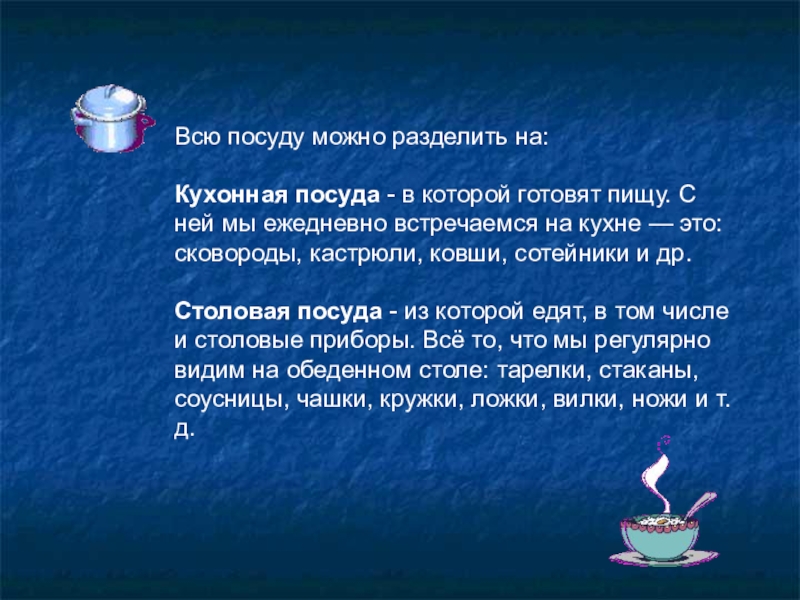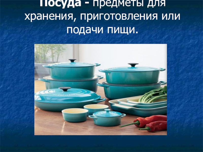 Слайд 2Посуда - предметы для хранения, приготовления или подачи пищи.