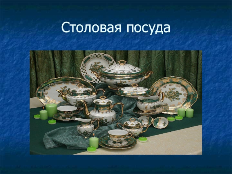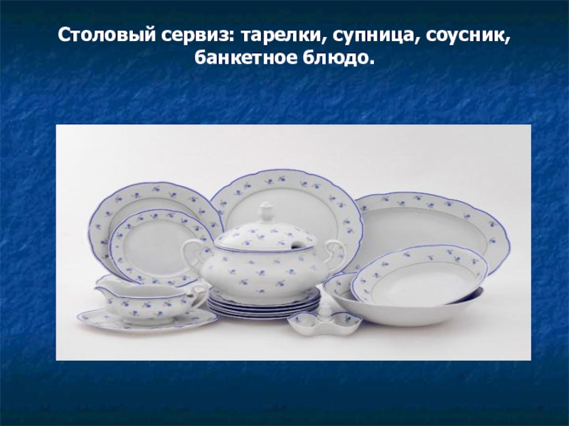 Слайд 7Столовый сервиз: тарелки, супница, соусник, банкетное блюдо.