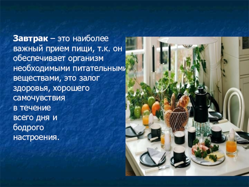 Слайд 18Завтрак – это наиболее важный прием пищи, т.к. он обеспечивает организм