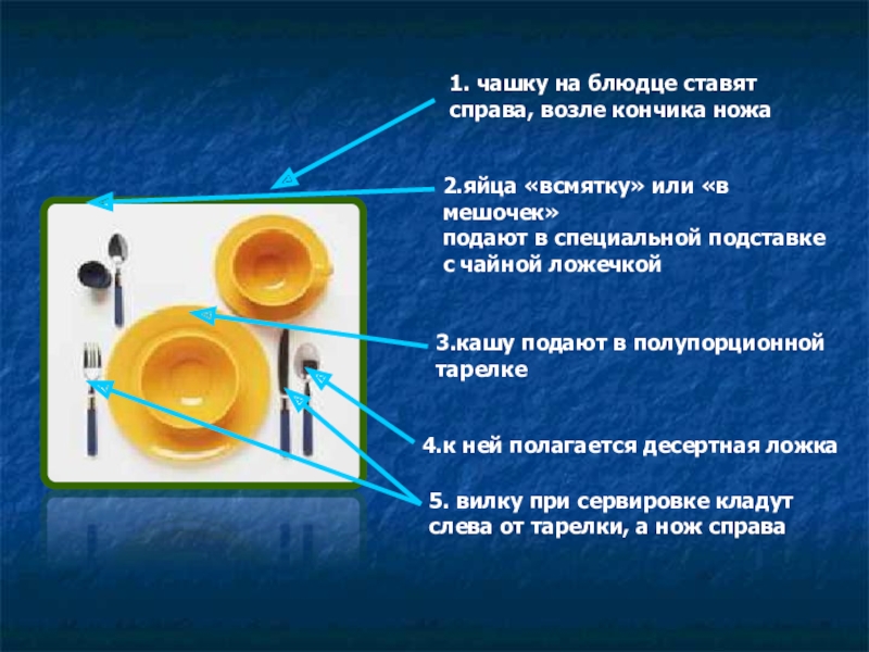 Слайд 231. чашку на блюдце ставят справа, возле кончика ножа