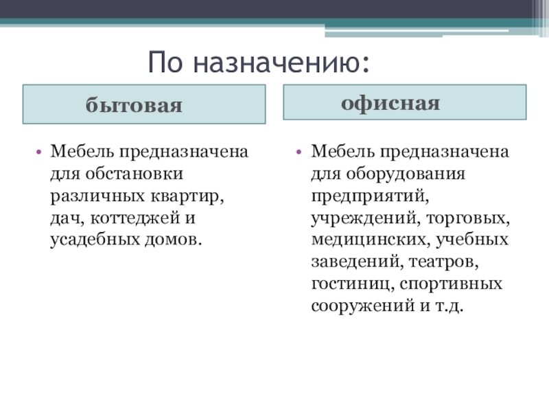 Мебель предназначена для оборудования предприятий, учреждений, торговых, медицинских, учебных заведений, театров, гостиниц, спортивных сооружений и т.д.