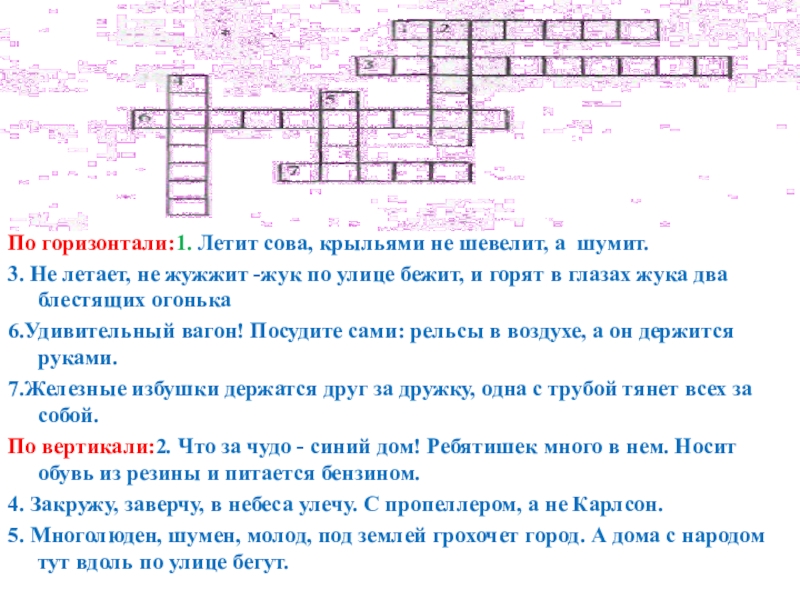 По вертикали:2. Что за чудо - синий дом! Ребятишек много в нем. Носит обувь из резины и питается бензином.