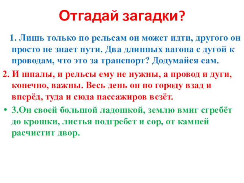 2. И шпалы, и рельсы ему не нужны, а провод и дуги, конечно, важны. Весь день он по городу взад и вперёд, туда и сюда пассажиров везёт.