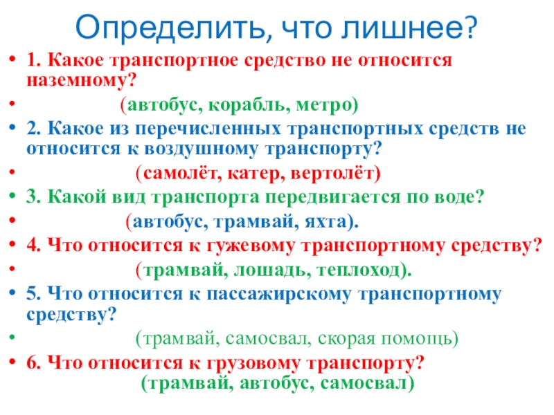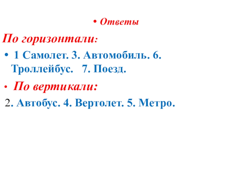 1 Самолет. 3. Автомобиль. 6. Троллейбус. 7. Поезд.