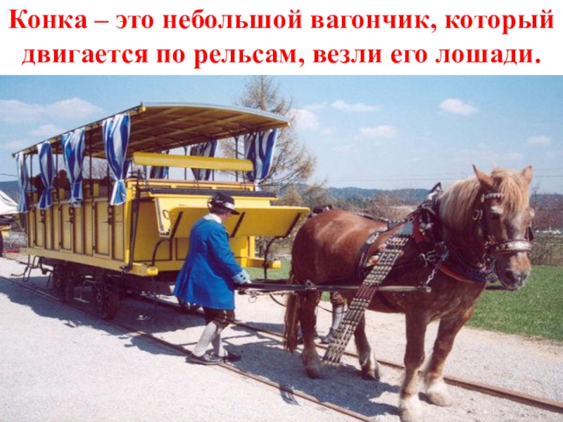 Слайд 18Конка – это небольшой вагончик, который двигается по рельсам, везли его