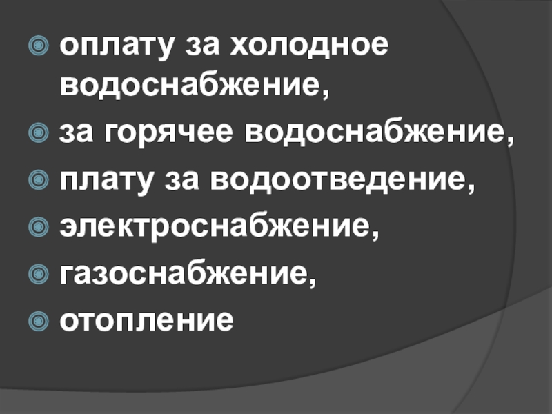 оплату за холодное водоснабжение, за горячее водоснабжение, плату за водоотведение, электроснабжение, газоснабжение, отопление