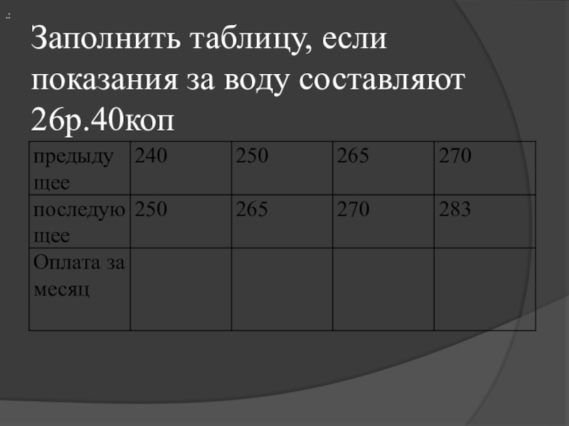Слайд 12Заполнить таблицу, если показания за воду составляют 26р.40коп