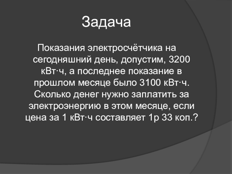 ЗадачаПоказания электросчётчика на сегодняшний день, допустим, 3200 кВт·ч, а последнее показание в прошлом месяце было 3100 кВт·ч.