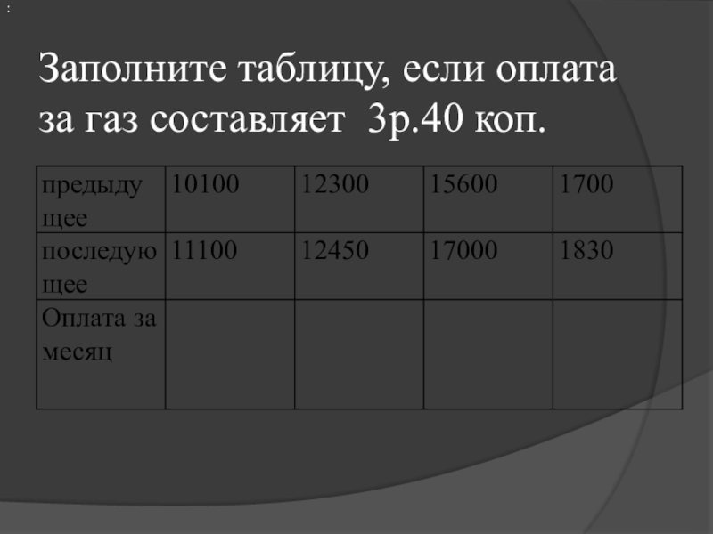 Слайд 11Заполните таблицу, если оплата за газ составляет 3р.40 коп.