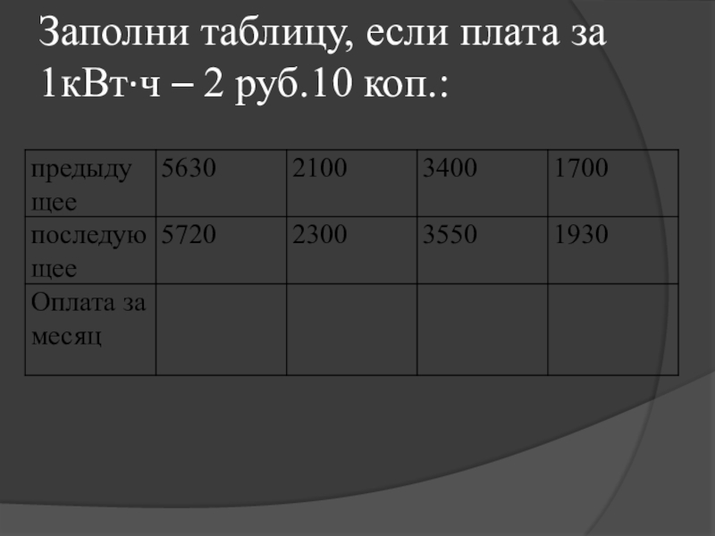 Слайд 10Заполни таблицу, если плата за 1кВт·ч – 2 руб.10 коп.: