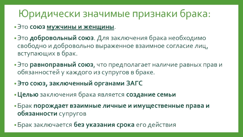 Слайд 4Юридически значимые признаки брака: