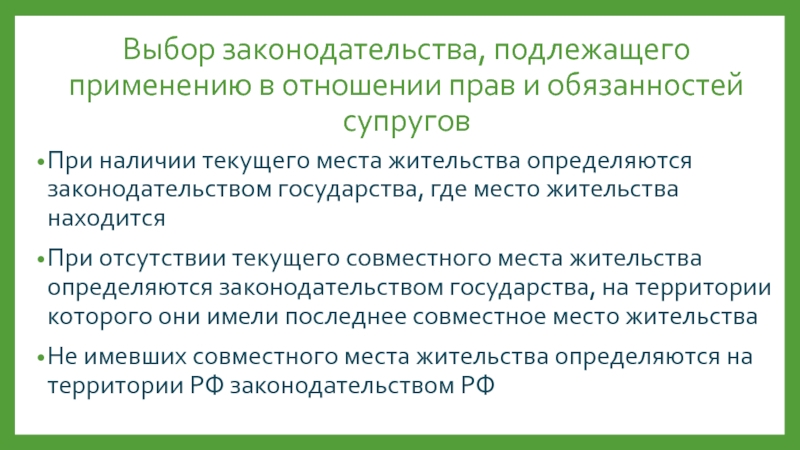 Слайд 25Выбор законодательства, подлежащего применению в отношении прав и обязанностей супругов