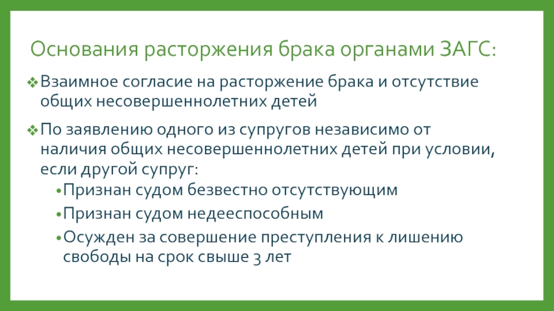 Слайд 17Основания расторжения брака органами ЗАГС: