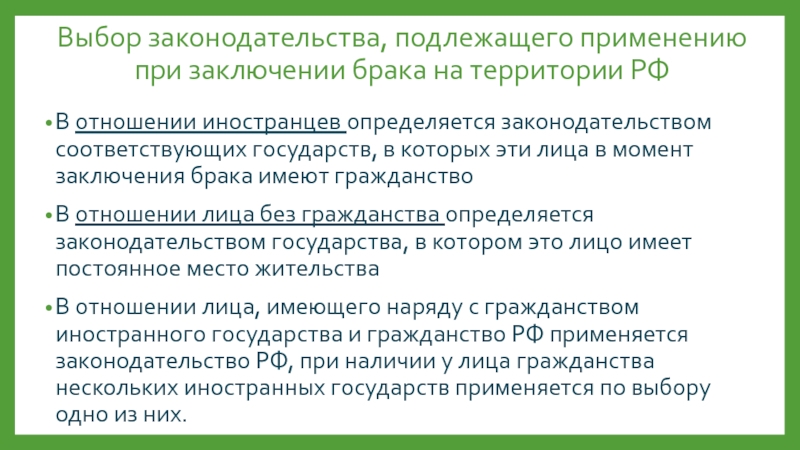 Слайд 23Выбор законодательства, подлежащего применению при заключении брака на территории РФ