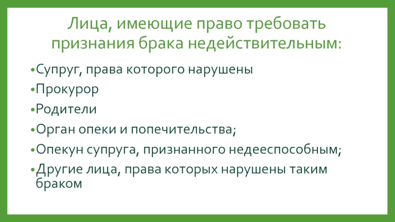 Слайд 11Лица, имеющие право требовать признания брака недействительным: