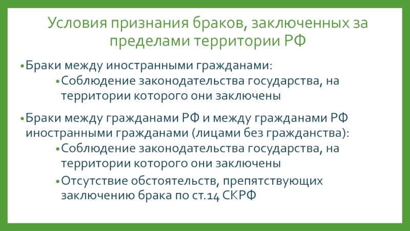 Слайд 24Условия признания браков, заключенных за пределами территории РФ
