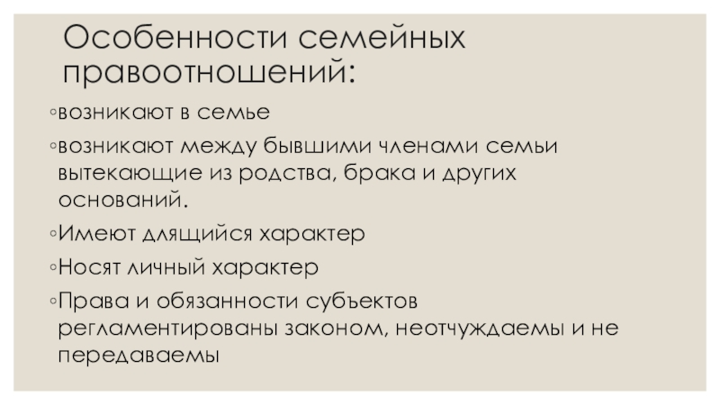 Особенности семейных правоотношений:возникают в семьевозникают между бывшими членами семьи вытекающие из родства, брака и других оснований.Имеют длящийся
