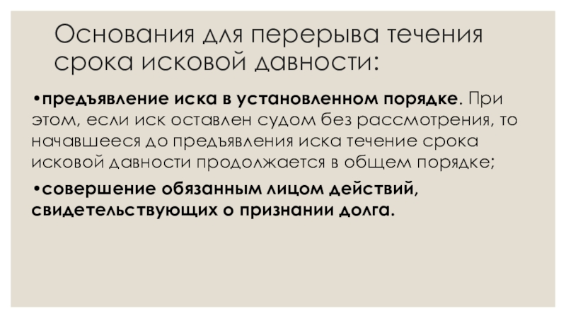 Основания для перерыва течения срока исковой давности: •предъявление иска в установленном порядке. При этом, если иск оставлен