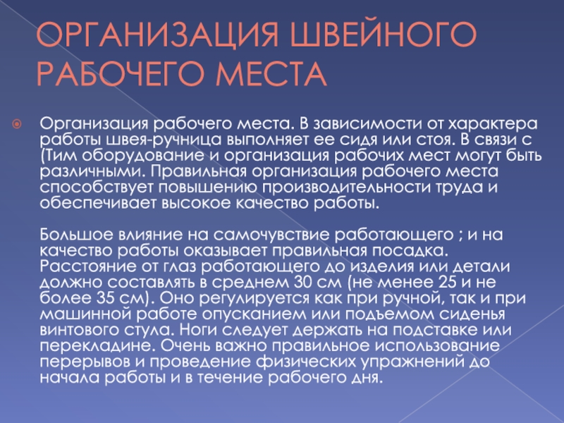 швея-ручница выполняет ее сидя или стоя. В связи с (Тим оборудование и организация рабочих мест могут быть различными. Правильная организация рабочего места способствует повышению производительности труда и обеспечивает высокое качество работы.