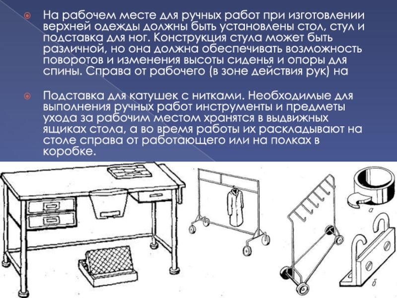 Слайд 6На рабочем месте для ручных работ при изготовлении верхней одежды должны