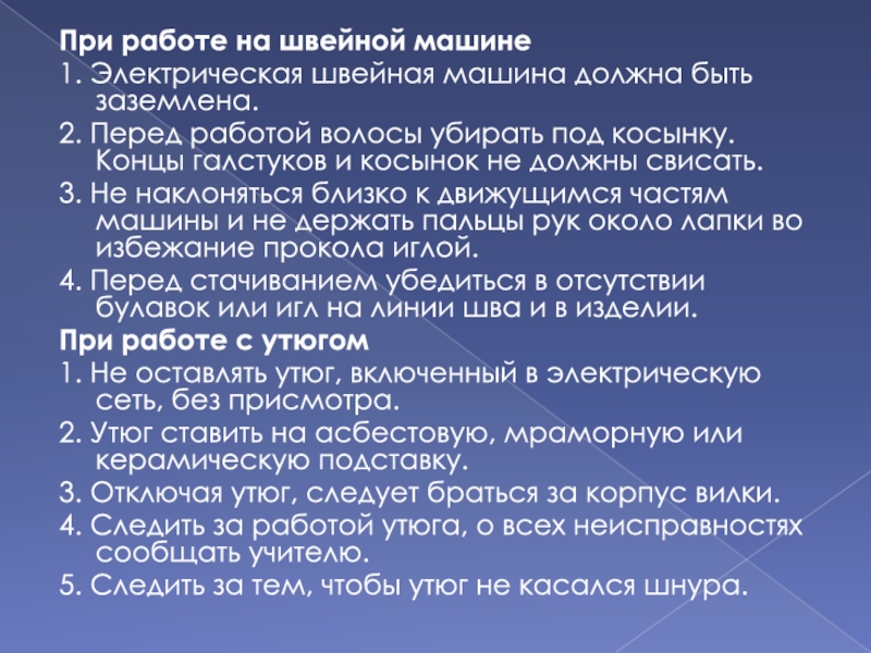 4. Следить за работой утюга, о всех неисправностях сообщать учителю.
