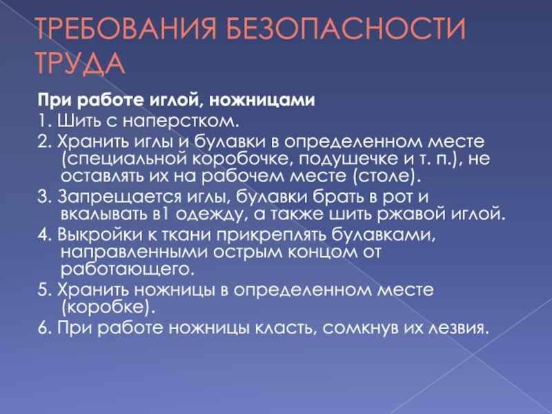 3. Запрещается иглы, булавки брать в рот и вкалывать в1 одежду, а также шить ржавой иглой.