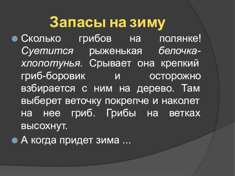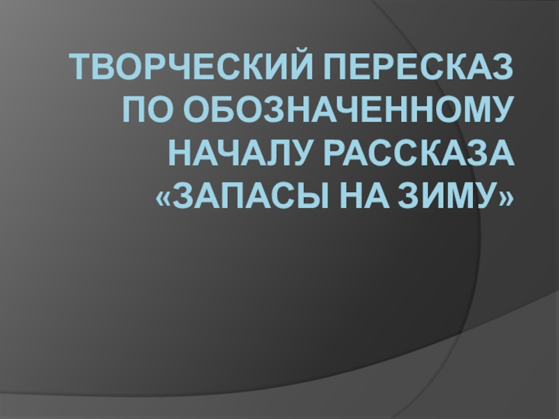 Слайд 1Творческий пересказ по обозначенному началу рассказа «Запасы на зиму»