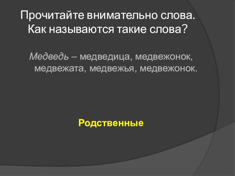 Прочитайте внимательно слова. Как называются такие слова? Медведь – медведица, медвежонок,  медвежата, медвежья, медвежонок.Родственные