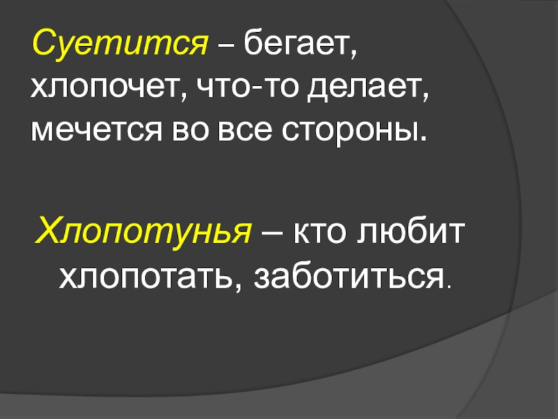 Слайд 18Суетится – бегает, хлопочет, что-то делает, мечется во все стороны.