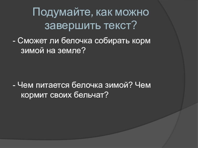 Подумайте, как можно завершить текст?- Сможет ли белочка собирать корм зимой на земле?- Чем питается белочка зимой?