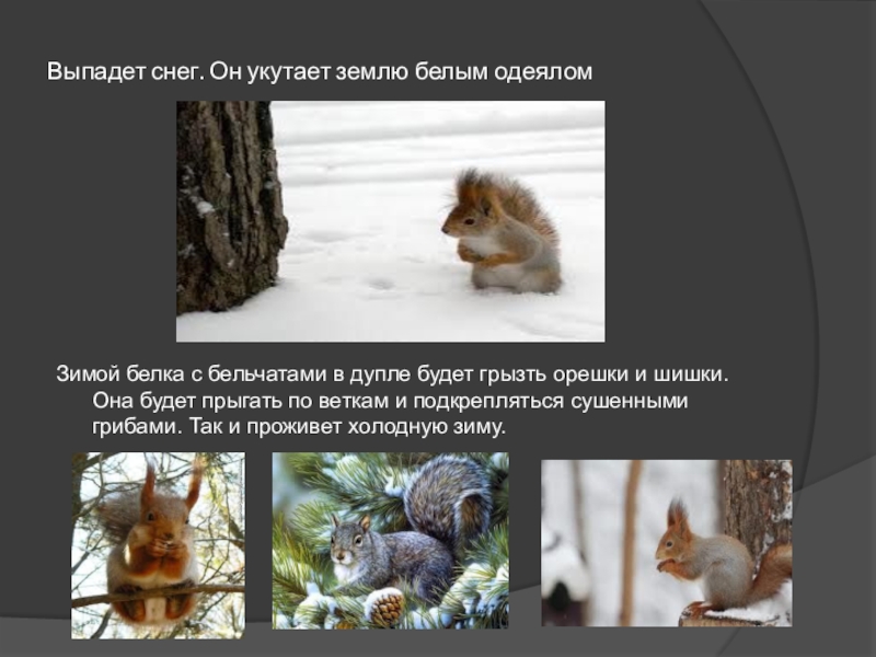 Выпадет снег. Он укутает землю белым одеяломЗимой белка с бельчатами в дупле будет грызть орешки и шишки.