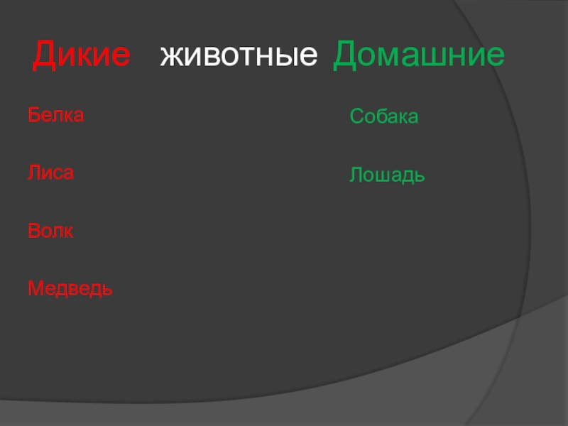 Дикие  животные ДомашниеБелкаЛисаВолкМедведьСобакаЛошадь