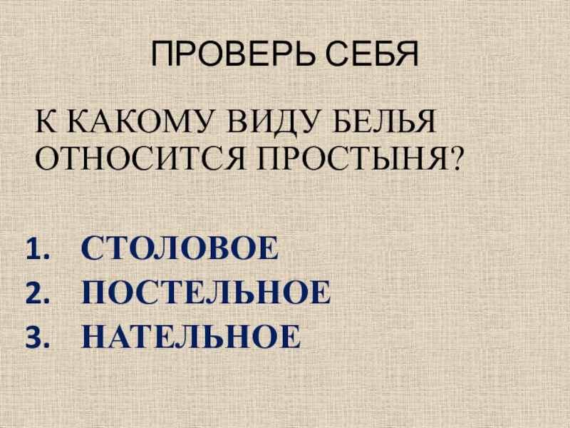 ПРОВЕРЬ СЕБЯК КАКОМУ ВИДУ БЕЛЬЯ ОТНОСИТСЯ ПРОСТЫНЯ?СТОЛОВОЕПОСТЕЛЬНОЕНАТЕЛЬНОЕ
