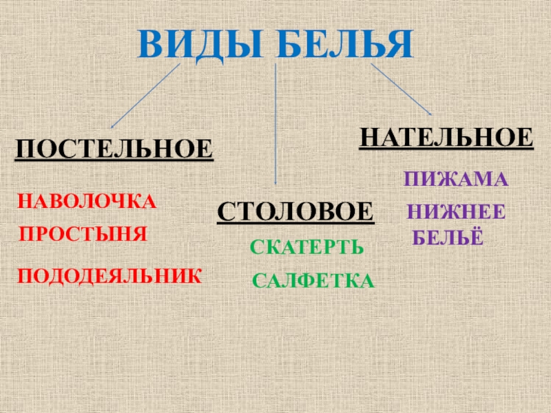 ВИДЫ БЕЛЬЯПОСТЕЛЬНОЕ НАВОЛОЧКАПРОСТЫНЯПОДОДЕЯЛЬНИКСТОЛОВОЕНАТЕЛЬНОЕСКАТЕРТЬСАЛФЕТКАПИЖАМАНИЖНЕЕ БЕЛЬЁ