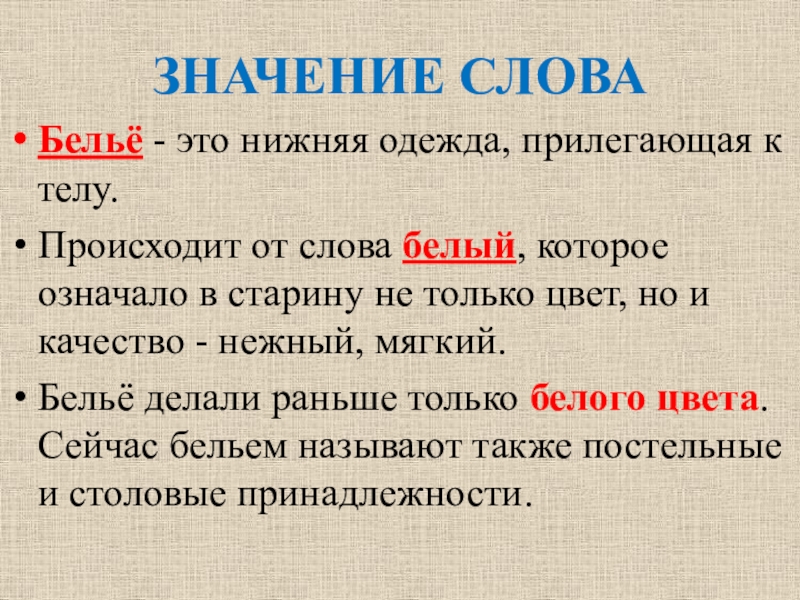 ЗНАЧЕНИЕ СЛОВАБельё - это нижняя одежда, прилегающая к телу. Происходит от слова белый, которое означало в старину не только цвет, но и качество - нежный, мягкий. Бельё делали раньше только белого цвета. Сейчас бельем называют также