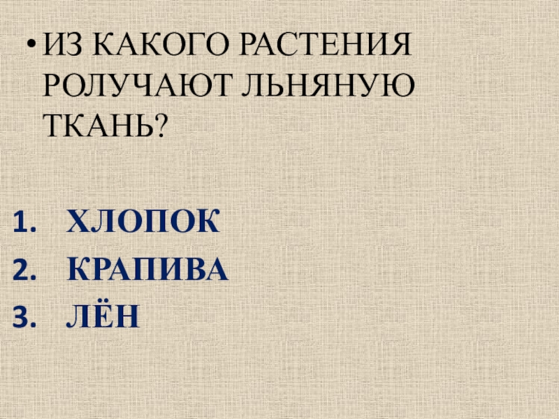 Слайд 9ИЗ КАКОГО РАСТЕНИЯ РОЛУЧАЮТ ЛЬНЯНУЮ ТКАНЬ?
