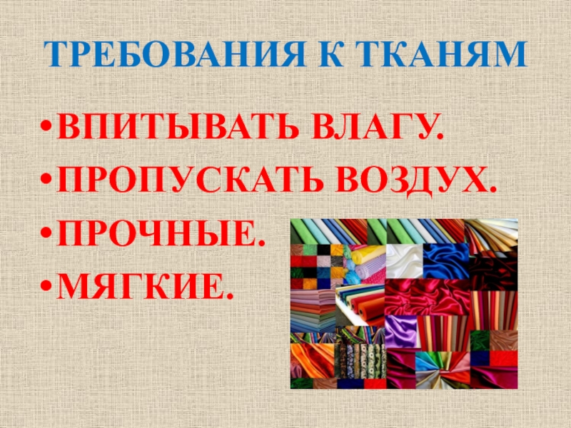 ТРЕБОВАНИЯ К ТКАНЯМВПИТЫВАТЬ ВЛАГУ.ПРОПУСКАТЬ ВОЗДУХ.ПРОЧНЫЕ.МЯГКИЕ.