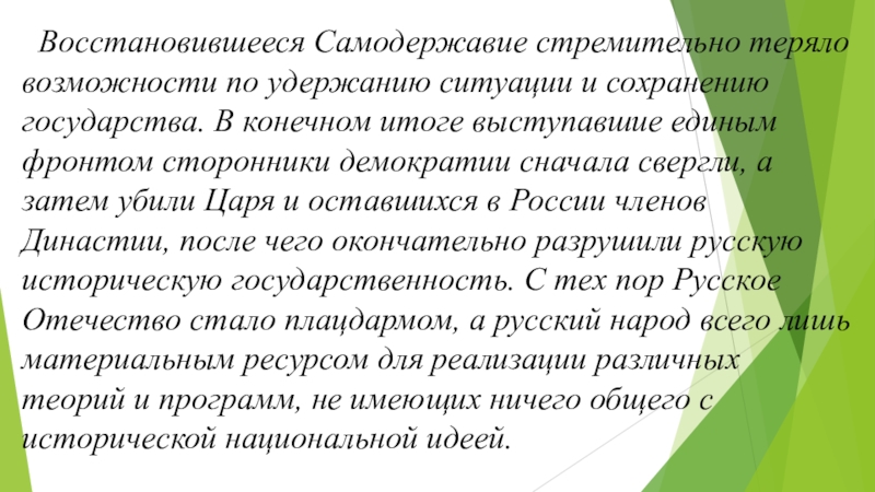 государства. В конечном итоге выступавшие единым фронтом сторонники демократии сначала свергли, а затем убили Царя и оставшихся в России членов Династии, после чего окончательно разрушили русскую историческую государственность. С тех пор Русское Отечество стало плацдармом, а русский народ всего лишь материальным ресурсом для реализации различных теорий и программ, не имеющих ничего общего с исторической национальной идеей.