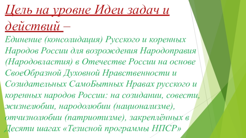 и коренных Народов России для возрождения Народоправия (Народовластия) в Отечестве России на основе СвоеОбразной Духовной Нравственности и Созидательных СамоБытных Нравах русского и коренных народов России: на созидании, совести, жизнелюбии, народолюбии (национализме), отчизнолюбии (патриотизме), закреплённых в Десяти шагах «Тезисной программы НПСР»