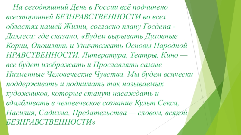 во всех областях нашей Жизни, согласно плану Госдепа - Даллеса: где сказано, «Будем вырывать Духовные Корни, Опошлять и Уничтожать Основы Народной НРАВСТВЕННОСТИ. Литература, Театры, Кино — все будет изображать и Прославлять самые Низменные Человеческие Чувства. Мы будем всячески поддерживать и поднимать так называемых художников, которые станут насаждать и вдалбливать в человеческое сознание Культ Секса, Насилия, Садизма, Предательства — словом, всякой БЕЗНРАВСТВЕННОСТИ»