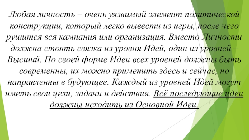 из игры, после чего рушится вся кампания или организация. Вместо Личности должна стоять связка из уровня Идей, один из уровней – Высший. По своей форме Идеи всех уровней должны быть современны, их можно применить здесь и сейчас, но направленны в будующее. Каждый из уровней Идей могут иметь свои цели, задачи и действия. Всё последующие идеи должны исходить из Основной Идеи.