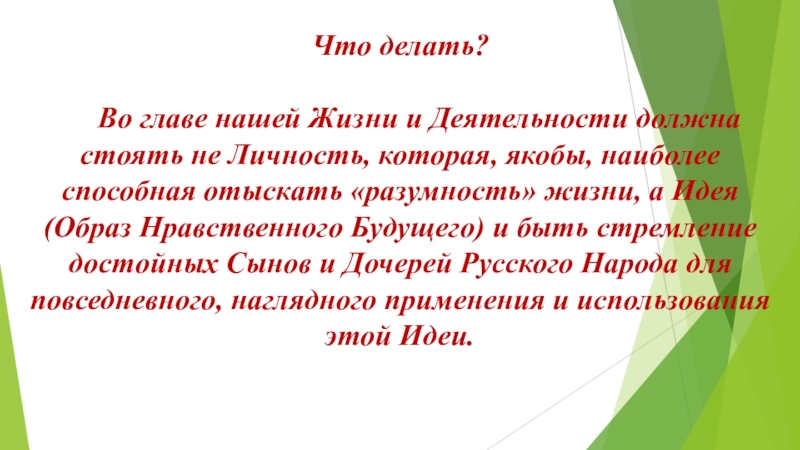 стоять не Личность, которая, якобы, наиболее способная отыскать «разумность» жизни, а Идея (Образ Нравственного Будущего) и быть стремление достойных Сынов и Дочерей Русского Народа для повседневного, наглядного применения и использования этой Идеи.