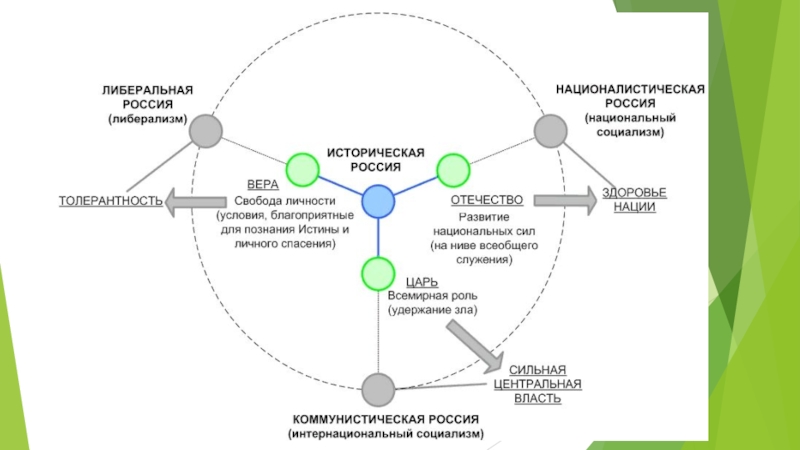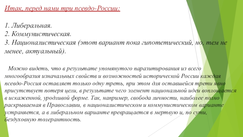 Можно видеть, что в результате упомянутого паразитирования из всего многообразия изначальных свойств и возможностей исторической России каждая псевдо-Россия оставляет только одну треть, при этом для оставшейся трети явно присутствует потеря цели, в результате чего элемент национальной идеи воплощается в искаженной, уродливой форме. Так, например, свобода личности, наиболее полно раскрываемая в Православии, в националистическом и коммунистическом варианте устраняется, а в либеральном варианте превращается в мертвую и, по сути, бездуховную толерантность.